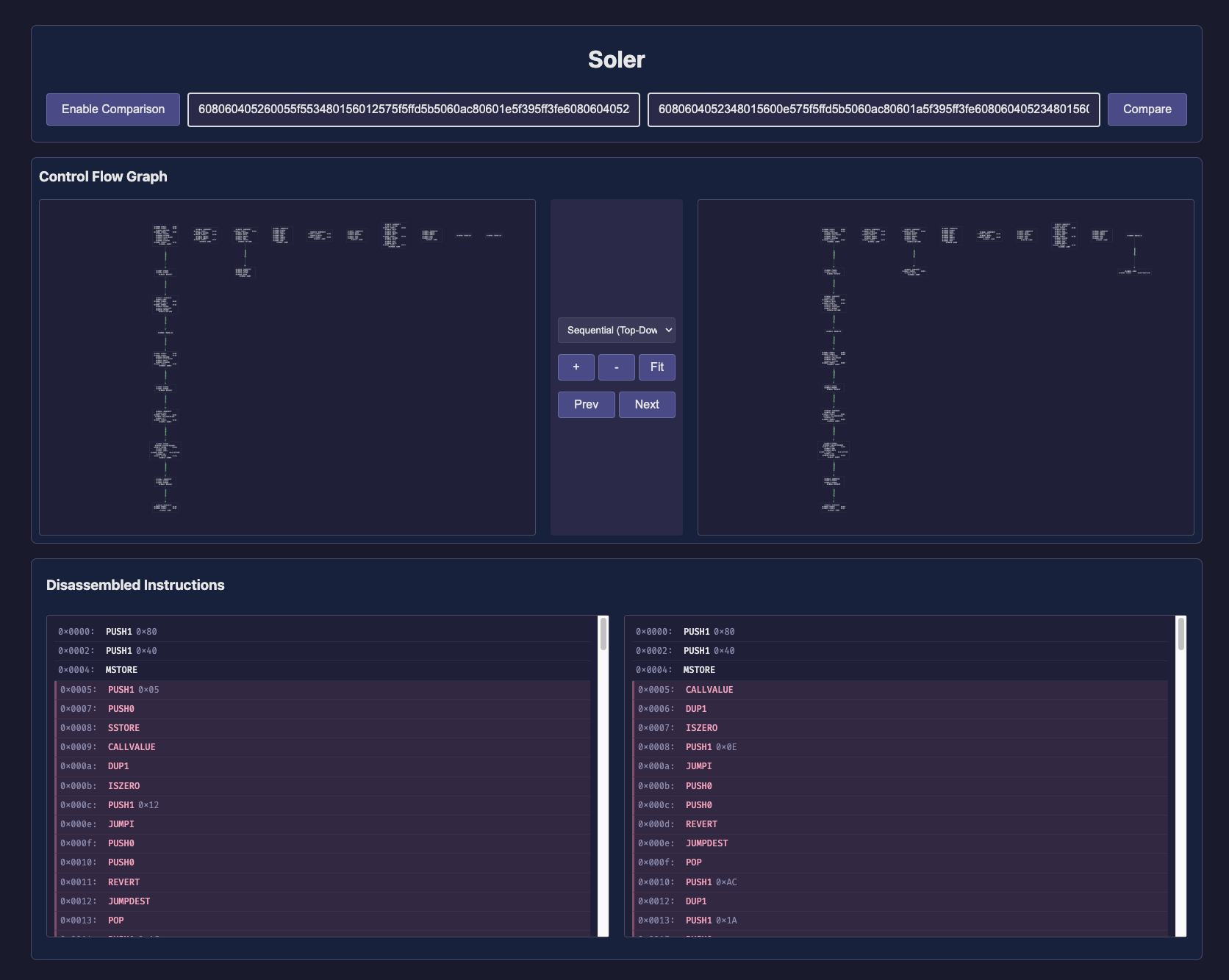 After inserting both bytecodes (NoConstant.sol is on the left and Constant.sol is on the right), a CFG (Control-Flow Graph) is created for both (this is not perfect AT ALL but it does the job). The opcodes are also displayed and compared with each other. If they’re different, they turn red as we can see in the image above. We can also go instruction by instruction clicking “Prev” or “Next”.
